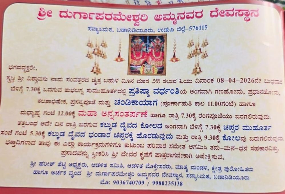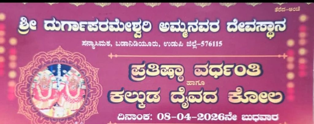 ಶ್ರೀ ದುರ್ಗಾಪರಮೇಶ್ವರಿ ಅಮ್ಮನವರ ದೇವಸ್ಥಾನ ಸನ್ಯಾಸಿಮಠ ಬಡಾನಿಡಿಯೂರು ಮುಲ್ಪ ಉಂದುವೇ ಬರ್ಪಿನ ಎಪ್ರಿಲ್ 8 ತಾರೀಕು ದಾನಿ ಪ್ರತಿಷ್ಠಾ ವರ್ಧಂತಿ ಬೊಕ್ಕ ಕಲ್ಕುಡ ದೈವದ ಕೋಲ ನಡಪರೆಗಿತ್ತುದ್,ನೆತ್ತ ಲೆಪ್ಪೋಲೆ ಬುಡುಗಡೆ ಕಜ್ಜೊ ಮಾ.8 ತಾರೀಕು ದಾನಿ ಐತಾರ ದೇವಳಡ್ ನಡತುಂಡ್. ಈ ಪೊರ್ತುಡ್ ದೇವಳದ ಅಧ್ಯಕ್ಷೆರ್, ಮೊಕ್ತೇಸರೆರ್, ಮಾತ್ರ ಮಂಡಳಿ,ಅರ್ಚಕೆರ್ ಉಪಸ್ಥಿತರಿತ್ತೆರು