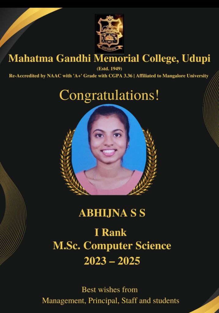 ಉಡುಪಿದ ಪ್ರತಿಷ್ಠಿತ ಎಂ.ಜಿ.ಎಂ ಕಾಲೇಜಿದ 2023-25ನೇ ಸಾಲುದ ಎಂ.ಎಸ್ಸಿ. ಕಂಪ್ಯೂಟರ್ ಸೈನ್ಸ್ ವಿದ್ಯಾರ್ಥಿನಿ ಅಭಿಜ್ಞಾ ಎಸ್.ಎಸ್. ಮೇರು ಅತ್ಯುತ್ತಮ ಸಾಧನೆ ಮಲ್ದೆರ್.. ಮೇರು 9.26 CGPA (90.34%) ಅಂಕದೊಟ್ಟುಗ್ ಮಂಗಳೂರು ವಿಶ್ವವಿದ್ಯಾಲಯ ಮಟ್ಟಡ್ ಸುರುತ ತಾನೊನ್ ಪಡೆತುದ್ ಕಾಲೇಜಿಗ್ ಕೀರ್ತಿ ಕನದೆರ್..