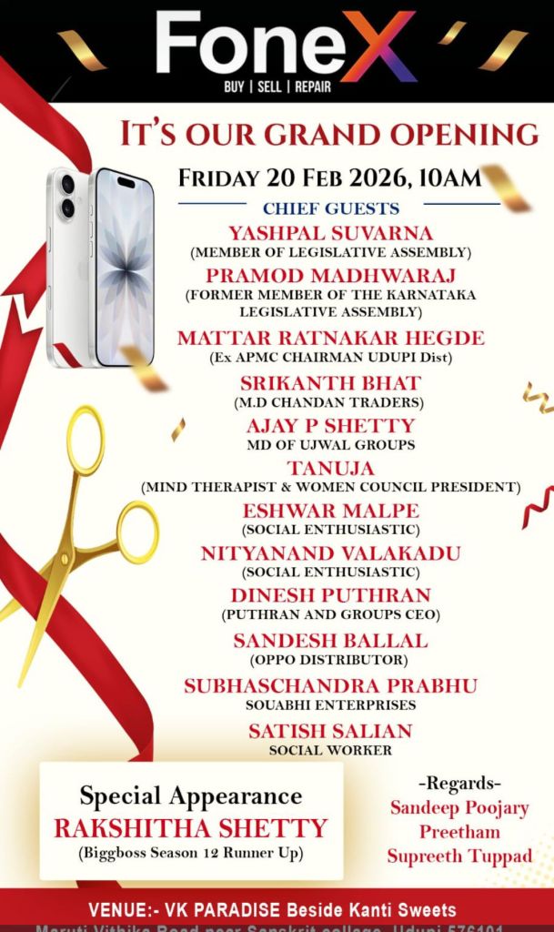 ಉಡುಪಿಡ್ ಉಂದುವೇ ಬರ್ಪಿನ 20 ತಾರೀಕುಗ್ ಪೊಸತಾದ್ ಓಪನ್ ಆವೊಂದುಂಡ್ ಫೋನೆಕ್ಸ್ ಮೊಬೈಲ್ ಶೋರೂಂ.ಉಡುಪಿ ಮಾರುತಿ ವೀತಿಕಾ ರೋಡ್ ಸಂಸ್ಕೃತ ಕಾಲೇಜಿದ ಕೈತಲುಡ್ ಈ ಶೋರೂಂ ಎಲ್ಲೆ ಓಪನ್ ಆಪುಂಡ್.
